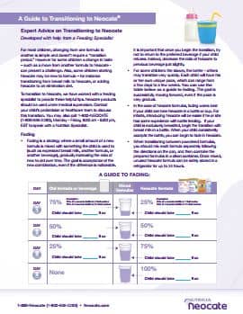 Because parents come up with lots of questions for these transition scenarios, we have worked with a Feeding Specialist in developing helpful tips to use in these transition situations. You can find two printable, 2-page documents with helpful tips titled ‘A Guide to Transitioning to Neocate’ and ‘Feeding Tips for a Successful Transition’ on this page of helpful resources.