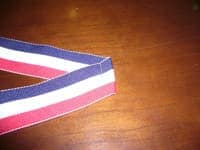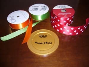I also wanted to be true to the 2016 Rio Olympics and Paralympics. This year the Olympic champions will have colorful green ribbons holding their hard-earned Olympic gold, silver and bronze medals. The Paralympian champions will have bright orange ribbons holding their medals. I chose ribbon to match these colors as closely as possible, and even found some festive bright red ribbon with white stars that I could not pass up!