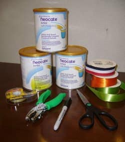 Supplies are simple. You will need some supplies to decorate your Neocate gold medal, ribbon, your favorite Neocate can lid for the Neocate goal medal material, some basic craft equipment, and a little fun and creativity. The craft equipment I used was