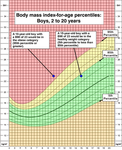 Here is an example of how weight and BMI are monitored on a growth chart after 2 years of age. You will see that children between the 5th and the 85th percentile are often classified as a healthy weight.