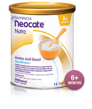 Neocate® Nutra is for children over 6 months of age. It mixes up to the consistency of infant cereal (though it’s not a cereal!), and we call it spoonable. Neocate Nutra is designed to help your child experience solid food as she develops feeding skills, while still avoiding the allergens that might make them sick. Many older children use Neocate Nutra to add texture and variety to their diet.  While Neocate Nutra provides some of every nutrient and is a good source of key nutrients like calcium and vitamin D, it is not enough on its own to meet all your child’s nutrition needs (it’s not nutritionally complete). Neocate Nutra is gluten-free, which means we regularly test to ensure that it is gluten-free. We take this extra step because so many children use this instead of an infant cereal, and having a gluten-free option is important to many families.