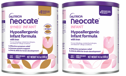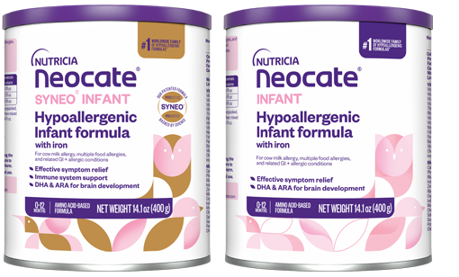 If human milk is not an option or needs to be supplemented, Neocate offers amino acid-based formulas (AAFs) for infants with severe food allergies – like Neocate Syneo Infant and Neocate Infant.